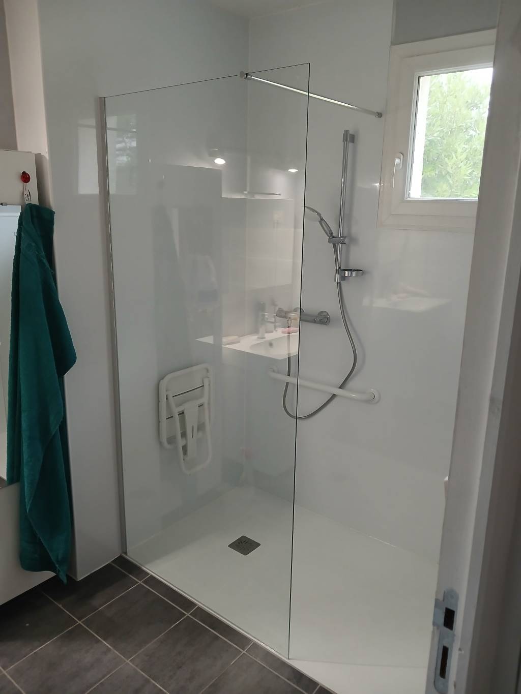 Grâce à ces aménagements, la salle de bain offre désormais un environnement plus sûr, ergonomique et confortable, répondant aux exigences de l’accessibilité PMR tout en conservant une esthétique soignée et moderne.